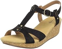 Tackle all your chores this weekend while in these Clarks England Wellfleet T-Bar sandals. Leather upper in a casual slingback platform wedge sandal style with a round open toe. T-strap features decorative metal studs. Ankle strap with adjustable metal buckle. Smooth lining cushioned footbed. 1/2 inch platform. Rubber traction outsole. 1 3/4 inch cork-wrapped wedge heel.