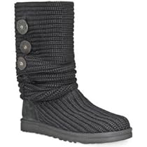 Enjoy toasty warm comfort and maximum versatility in the UGG(R) Australia Classic Cardy boot. Crocheted knit sweater-inspired upper in a tall pull on boot style with a round toe. A 14 1/2 inch pull on shaft features three large wooden logo button closures that can be unbuttoned to fold over into a mid calf height. Crochet fabric lining cushioned shearling topped insole. Flexible canvas trimmed foam rubber midsole textured rubber traction outsole. 1 inch heel.